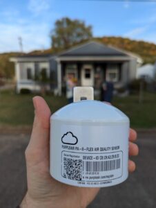 A PurpleAir monitor, used in our community project, tracks real-time air quality and sends alerts when pollution levels become unsafe.